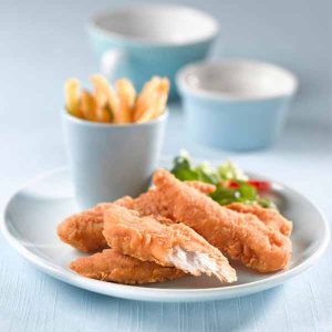Chicken breast meat, chopped and shaped in a light, crispy breadcrumb.