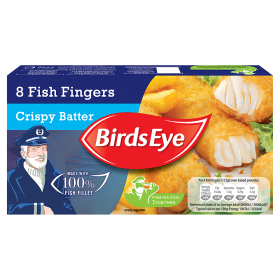Prefried Alaska pollock fillet fish fingers in a crispy batter.Each and every Birds Eye fish finger is irresistibly tasty and full of goodness. We combine the finest 100% fish fillet with our delicious light and crispy batter to give you healthy and happy teatimes! Empty plates guaranteed!