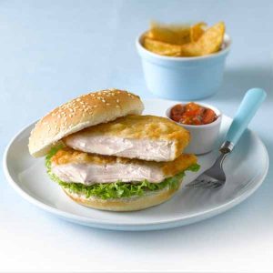 Fully cooked chicken breast fillets in a crispy batter coating.