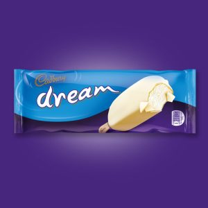 Vanilla flavour ice cream covered in Cadbury Dream white chocolate
