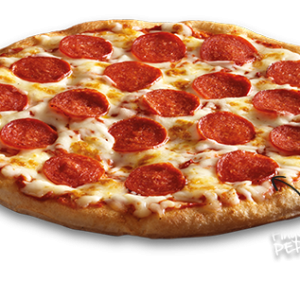Stone baked pizza base topped with tomato sauce, mozzarella & cheddar cheese and Pepperoni