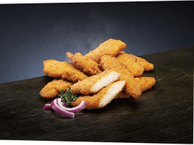 Cooked and frozen chicken breast inner fillets, coated in a southern fried breadcrumb.