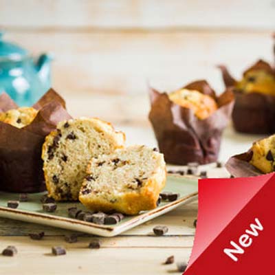 A sweet vanilla flavoured muffin with dark chocolate chips.